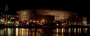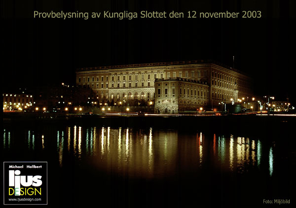 The Royal Castle in Stockholm Exterior lighting of the Royal Castle in Stockholm Pictures from the lighting test executed the 12 of November 2003. In this lighting test, which is the largest scale test done in the city of Stockholm, more than half of the Royal Castle were exposed. Orderer: Trafikkontoret in Stockholm as part of the project "Nightlight" (Nattljus). The present lighting of the Royal Castle has nothing in common with this proposition. |