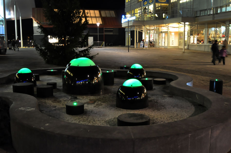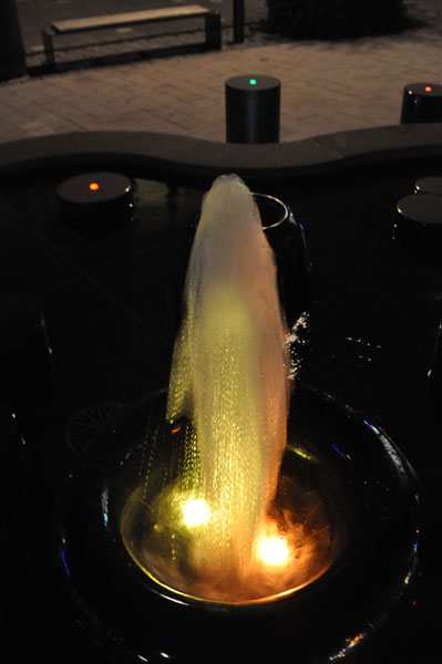 Ljussättning av nybyggd fontän ritad av konstnären Thomas Nordström.