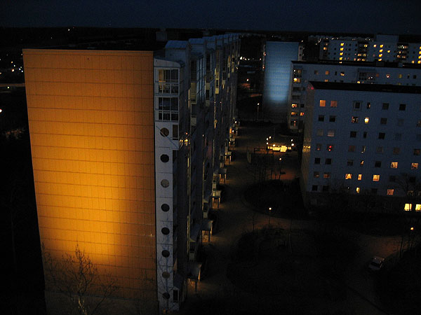 av Gert Marcus färgsatta fasader i bostadsområdet Flemingsberg. 2003.