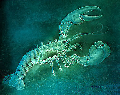 av Peter Sitell, etsat glas "hummer", Berns Salonger. Ljussättning av glaskonstverk. 1999.
