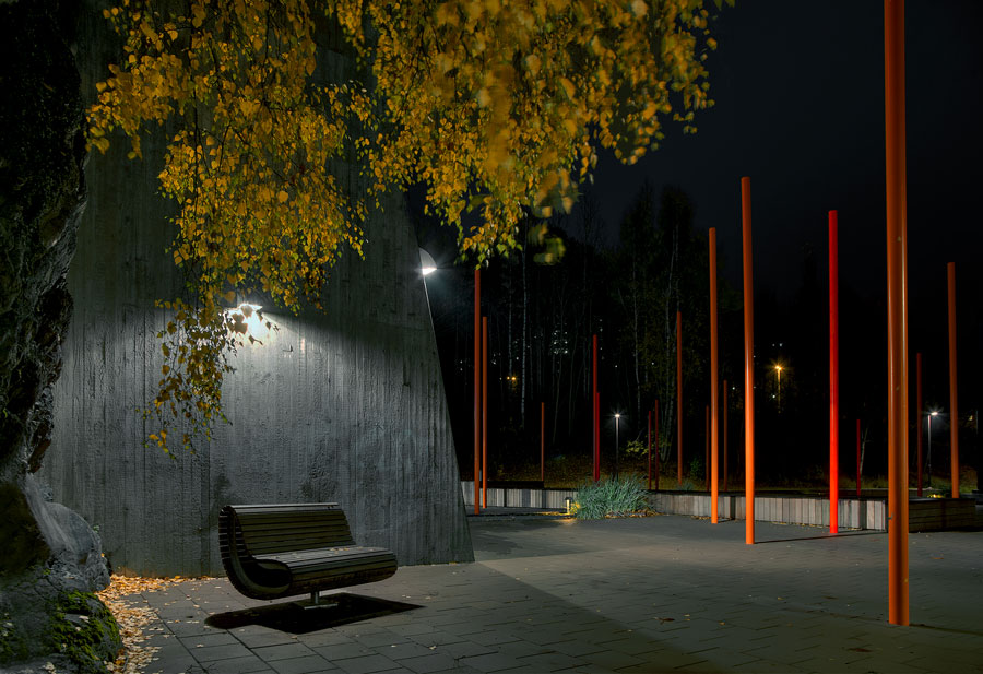 Masmo, Huddinge, 2013. Ljussättning av nyanlagt torg vid entrén till T-banan. Uppdragsgivare: Huddinge Kommun. Landskapsarkitekt: Land Arkitektur AB, Anders Kling, Marta Wännman. Armatur Design: Michael Hallbert Smidesarbeten: JG Rostfria AB, Gunnar Hillgren Led-belysning: Luxlight AB, Thom Elvinsson Elmontage: Hans Tormund Foto: Olof Thiel och Michael Hallbert Tillbaka |