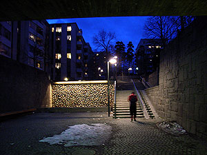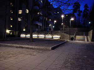 planteringsytor samt vattenfall utmed gångväg. 2003. Beställare: Trafikkontoret/ Sören Spetz. Elentreprenör: Bogfelts AB/Markus Segerlund. Landskapsarkitekt: Sycon. Foto: Alf Orvesten Tillbaka |